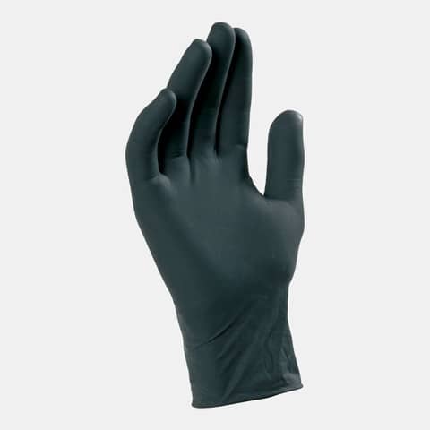 Guanto monouso ambidestro in nitrile nero senza polvere, con bordino, ottimo per tatuatori e parrucchieri, elevata biocompatibilità (esente da lattice naturale), confezione da 100 pz. Spessore 0,09 mm. Categoria di rischio: DPI 3^ categoria.
