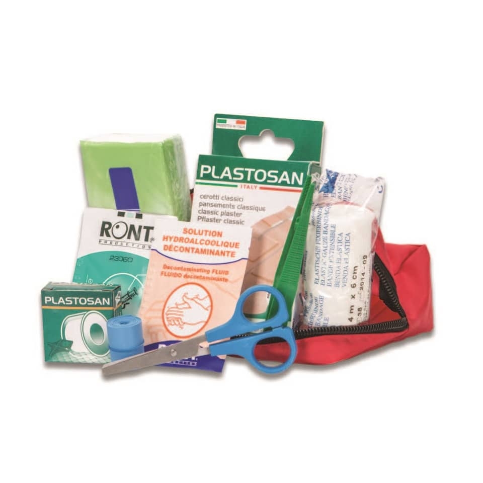 | Contenuto: | 1 paio di guanti sterili - 1 benda elast. cm. 6x4 m. -2 bustine sapone liquido disinf. 5 ml. - 3 salviette disinfettanti - 1pinzetta - 1 paio di forbici - 1 rocchetto cerotto adesivo tela -10 teli assorbenti - 1 astuccio da 10 cerotti varie misure - 2 bustedi garza sterile - 1 laccio emostatico - 1 manuale di prontosoccorso multilingua |