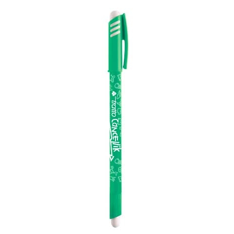 Penne a sfera cancellabili Tratto Cancellik. Gli errori hanno le ore contate. La linea Tratto Cancellik si caratterizza per due importanti fattori: la doppia gomma e il design innovativo del cappuccio, per renderla ancora più accattivante! Le gomme sono nel cappuccio e nel corpo della penna. L'inchiostro di Tratto Cancellik diventa permanente dopo circa 24 ore. La penna è dotata di cappuccio antisoffocamento che ne permette l'utilizzo in estrema sicurezza e di spazio per la personalizzazione del nome che permette di renderla riconoscibile. Colore: verde. Codice produttore: 826104