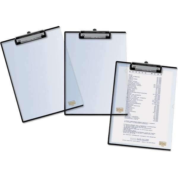 Elegante portablocco in materiale plastico trasparente che consente la lettura da entrambi i lati. Il documento da consultare può essere inserito tra le due facciate del portablocco. Molla in metallo rivestito. Formato 33x22 cm.