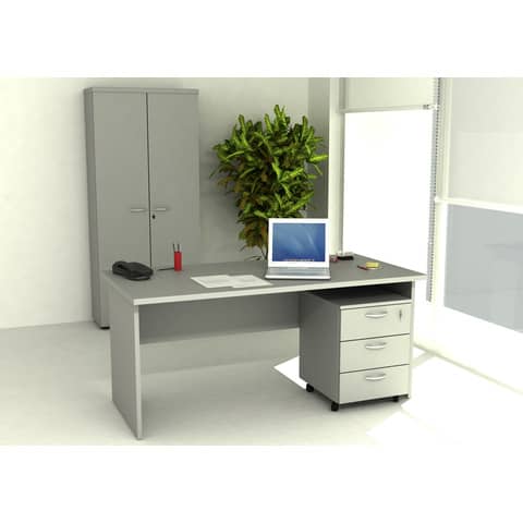 Scrivania fianchi melaminico cm 160 X 80 X 72 h, grigio. Presto, linea economica ma caratterizzata da soluzioni tecniche di livello superiore. Realizzata in materiale bilaminato nobilitato melaminico spessore 22 e 18 mm, conforme norme UNI e EN classe E1. Piani antigraffio ed antiriflesso, maniglie di mobili e cassettiere in materiale antiurto colore grigio alluminio. Maniglie di mobili e cassettiere in materiale antiurto colore grigio alluminio. Scrivanie con bordo dei piani in ABS 3 mm antiurto ed assenza di spigoli vivi, disponibili in 4 modelli di fianchi: pannello in melaminico, ad “L” in metallo verniciato nelle versioni grigio alluminio od effetto cromato completi di piedini regolabili in altezza e canalina passacavi ispezionabile, a ponte in metallo verniciato grigio alluminio con sezione 40x40 mm. Il raccordo angolare può essere sorretto da un supporto metallico cilindrico opzionale (Ø 6 cm, h69,5 cm) completo di piede regolabile. Codice produttore: 003+60111/9